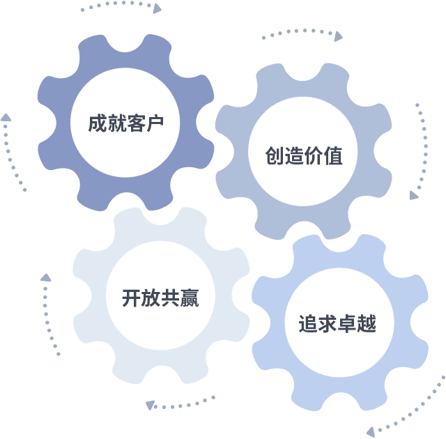 成就客户是一切决策的出发点,,,,创造价值是衡量所有工作的标准,,追求卓越是我们做事做人的态度,,,开放共赢是我们的格局也是最终的结果。。。。价值观的齿轮环环相扣,,,,推动着组织里的每个人不断向前。。。。
